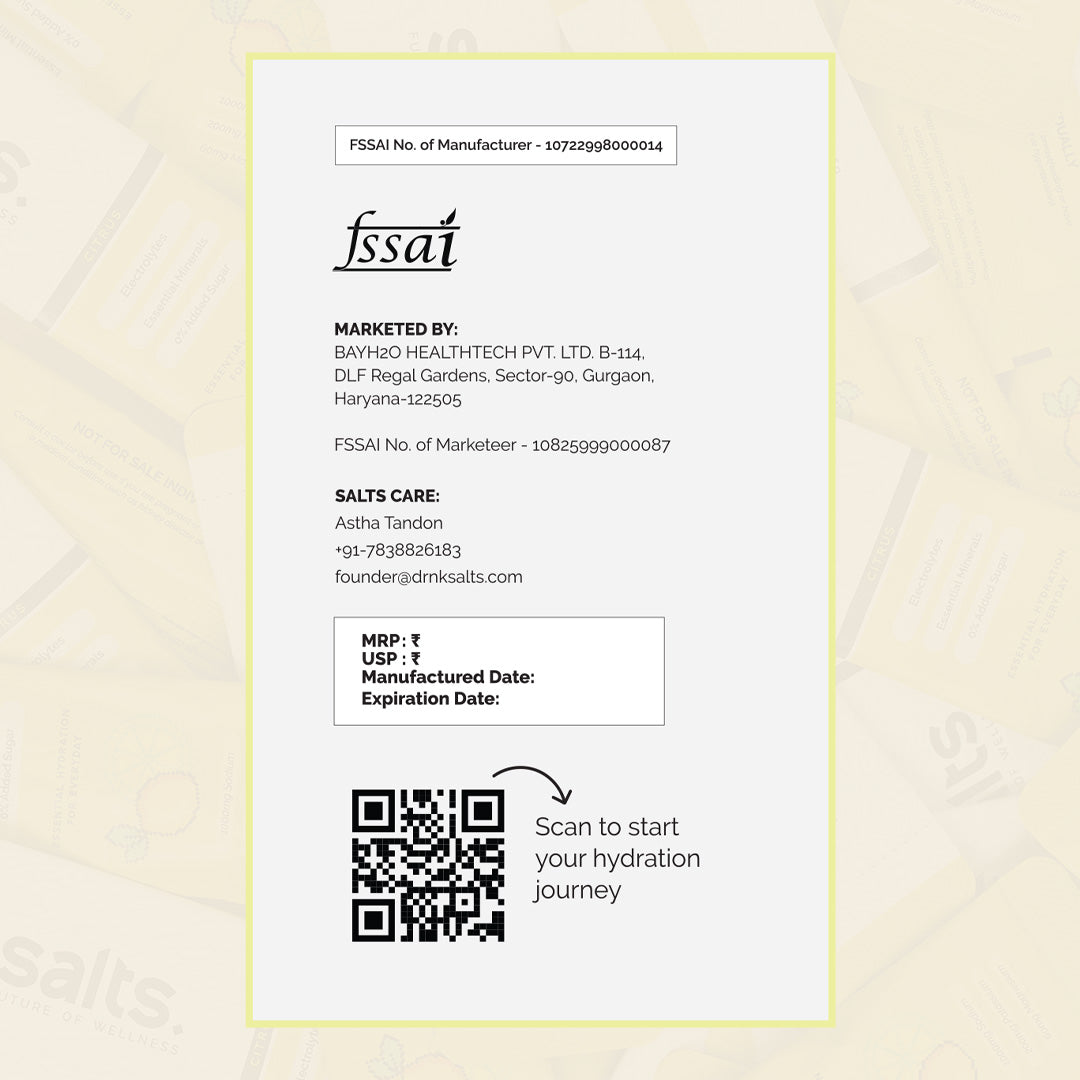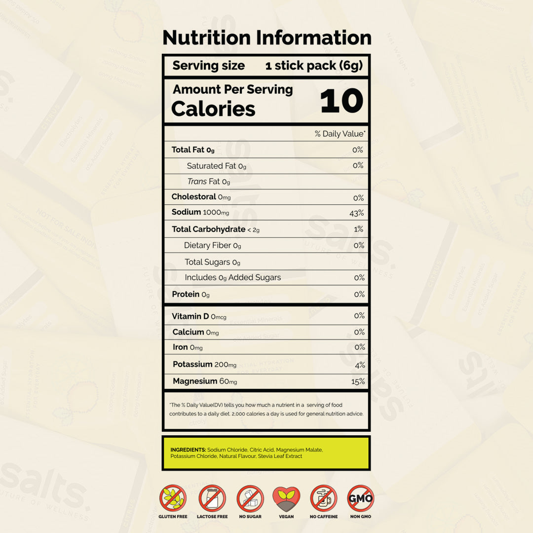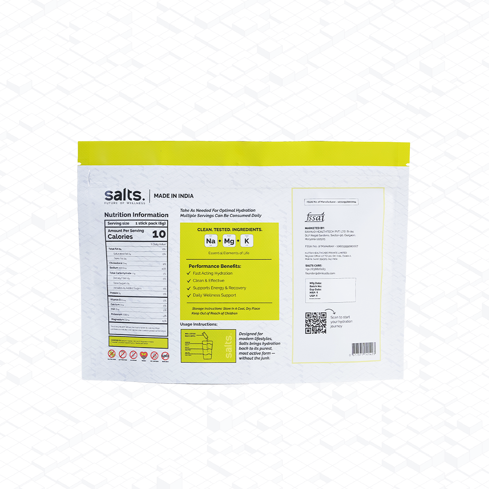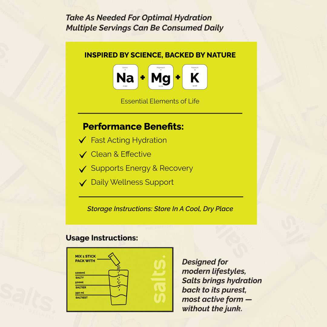 We get electrolytes from the food and drink we consume, but there are times when that is not enough, such as when exercising, unwell or on a hot day. Salts Hydrate is an electrolytes mix in a convenient serving to replenish your electrolytes and keep your body functioning at its best.