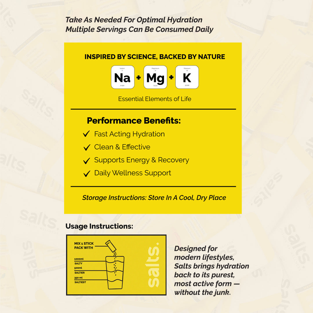 We get electrolytes from the food and drink we consume, but there are times when that is not enough, such as when exercising, unwell or on a hot day. Salts Hydrate is an electrolytes mix in a convenient serving to replenish your electrolytes and keep your body functioning at its best.